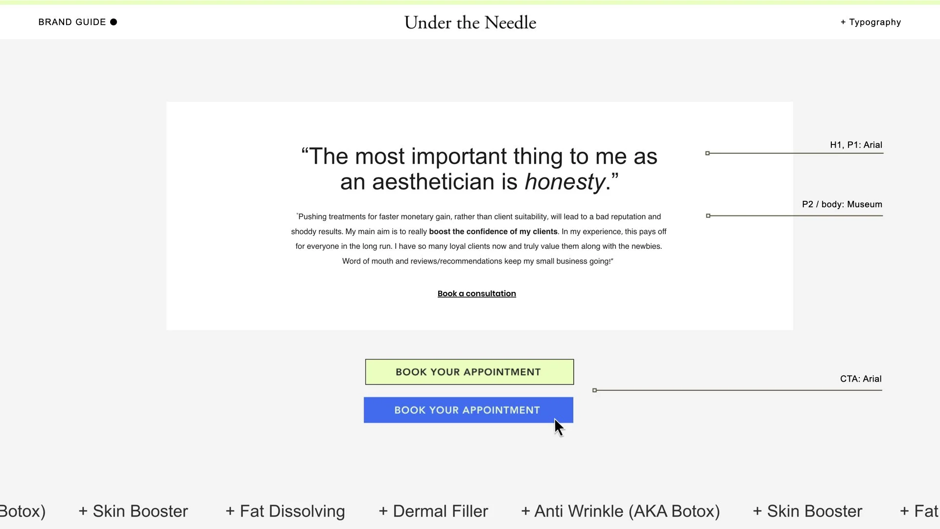 Olivia Rudman is an aesthetic practitioner offering aesthetic services such as botox and filler at her salon, Under The Needle. The brand needed some refinement and defining brand rules, along with a website design and build that oozes personality, whilst remaining clean, fresh and professional - but not mature or clinical. The majority of Under The Needle’s clients are of a younger demographic (preventions vs. cure) primarily gained from social media, so the branding needed to be Insta-worthy and youthful.