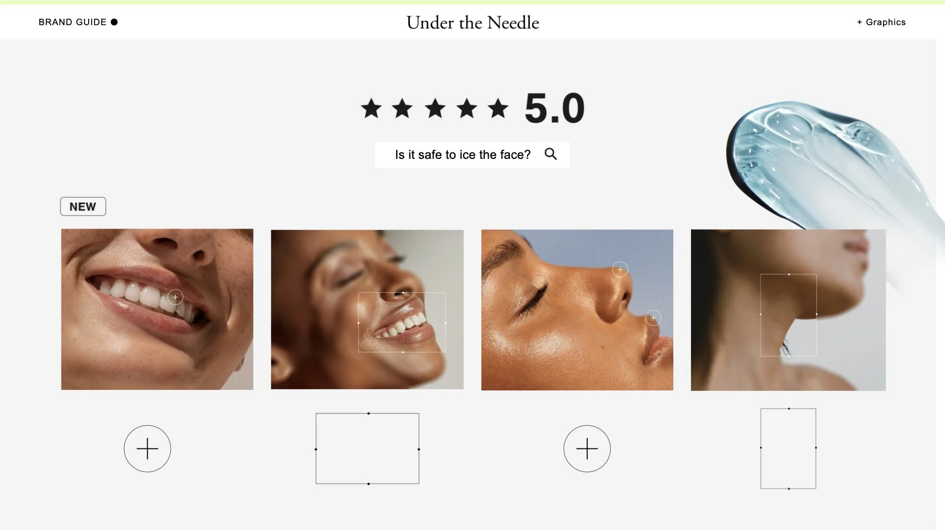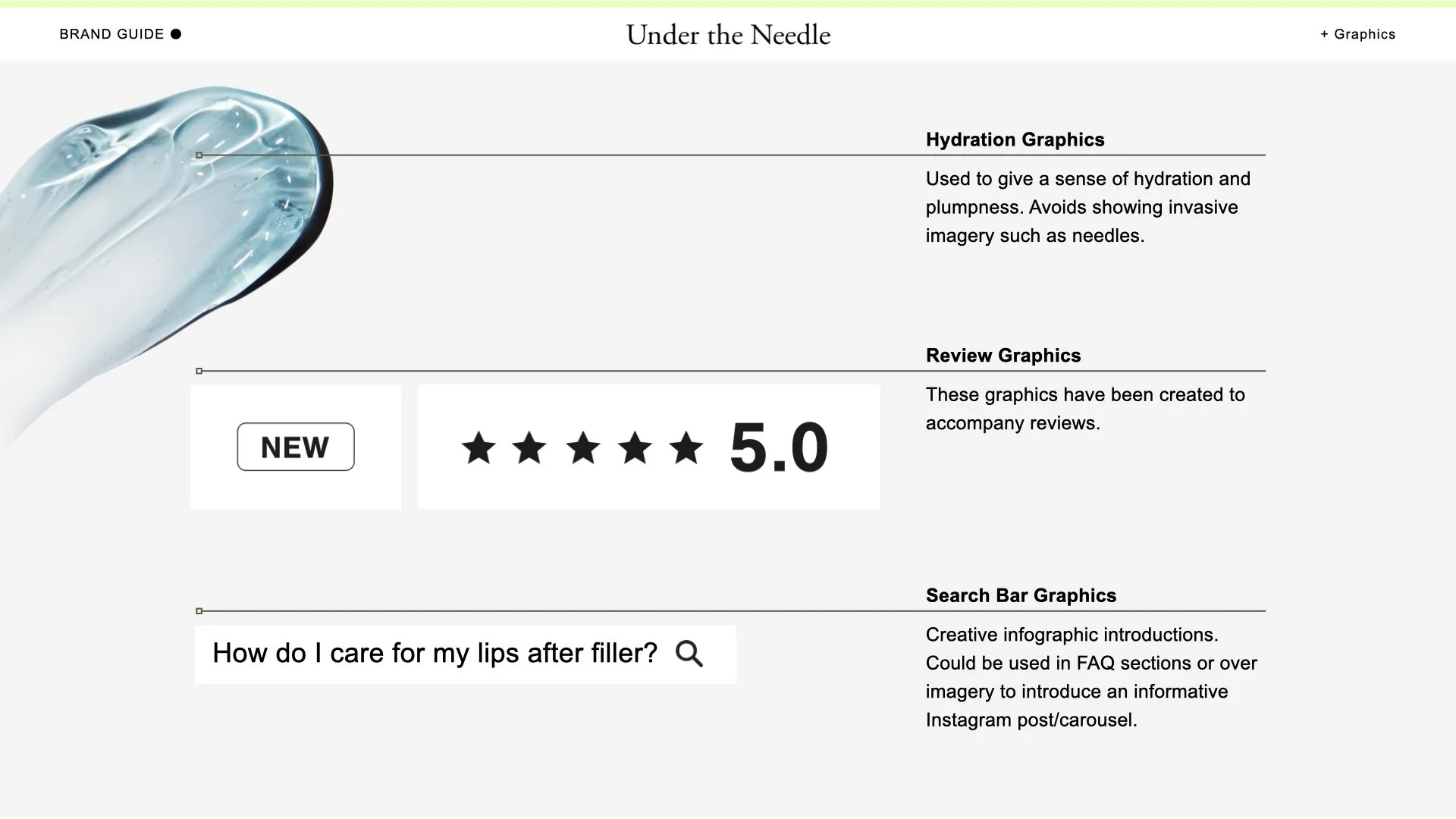 Brand graphics include liquid images and swatches that ooze hydration and plumpness inspired by the hyaluronic acid and desired healthy appearance.