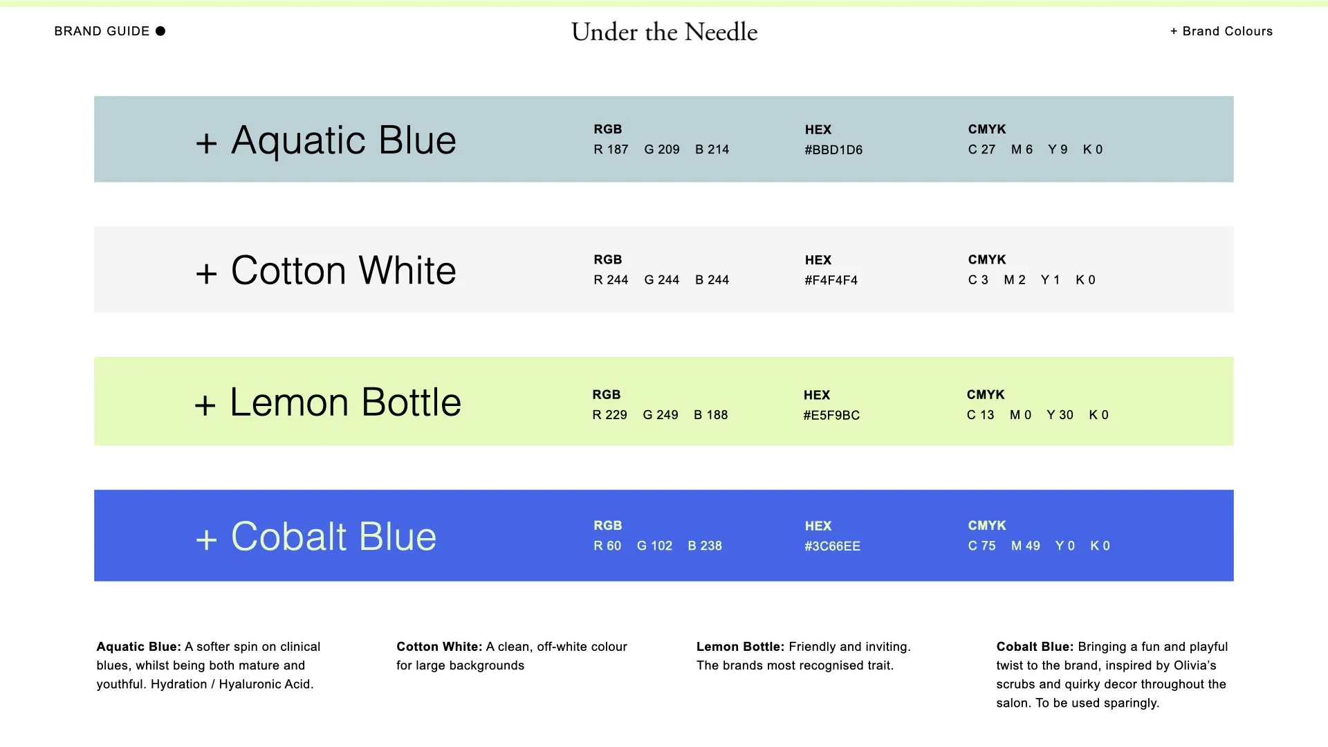 Cobalt Blue for hyperlinks/roll-overs: Bringing a fun and playful twist to the brand, inspired by Olivia’s scrubs and quirky decor throughout the salon.